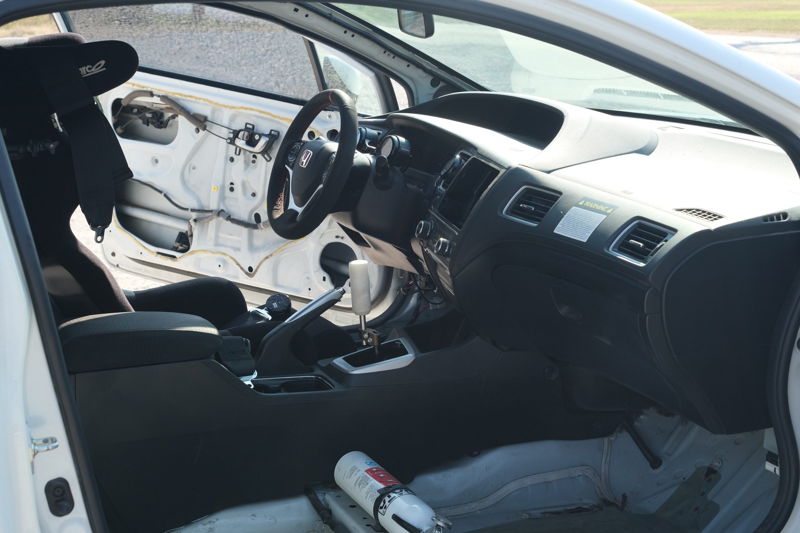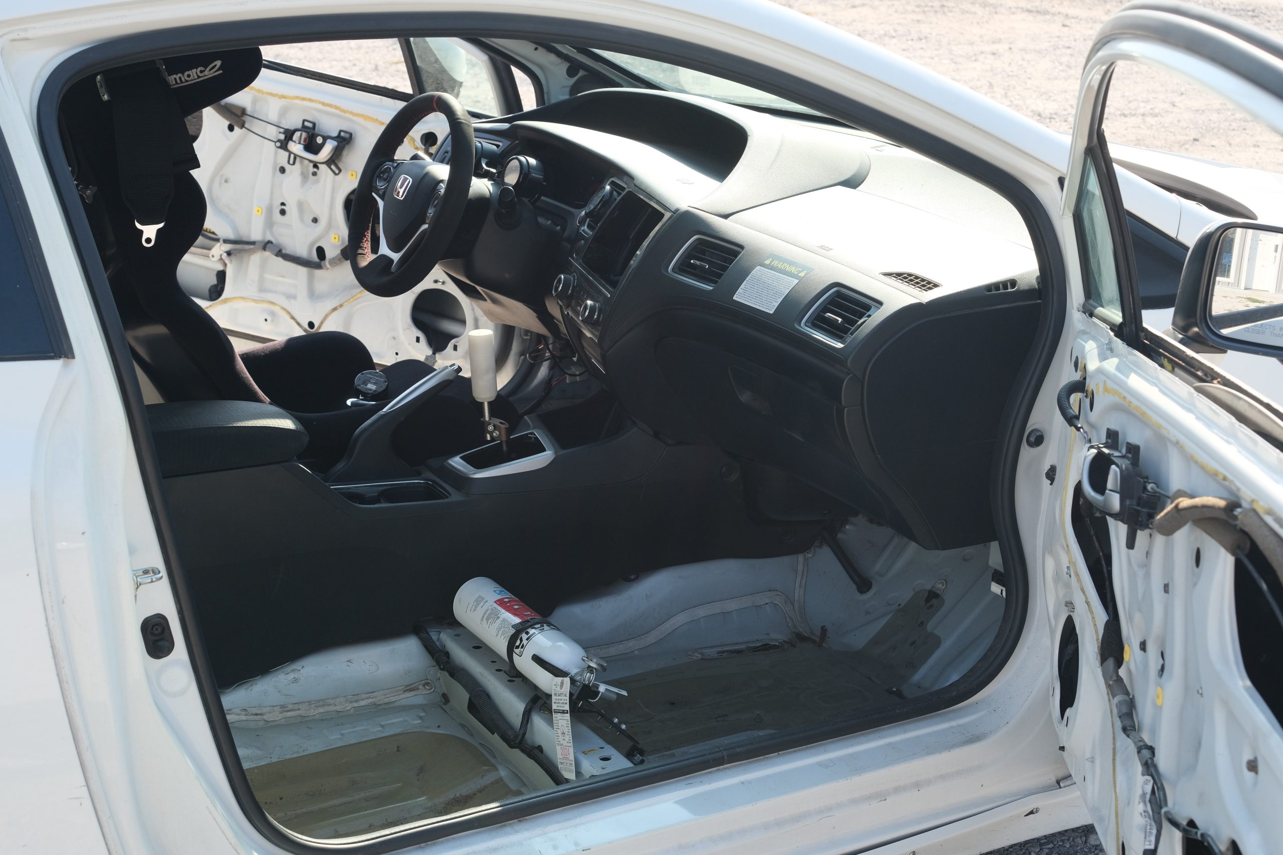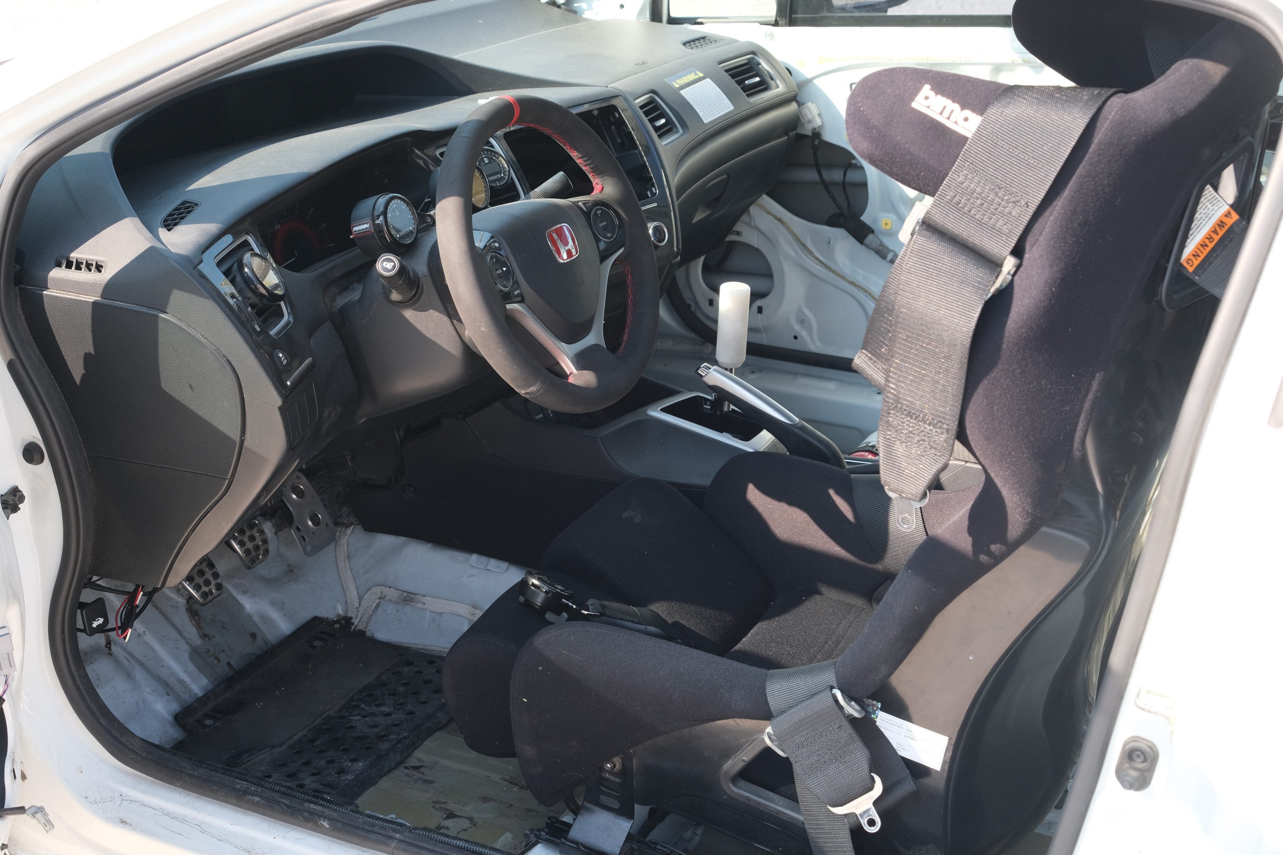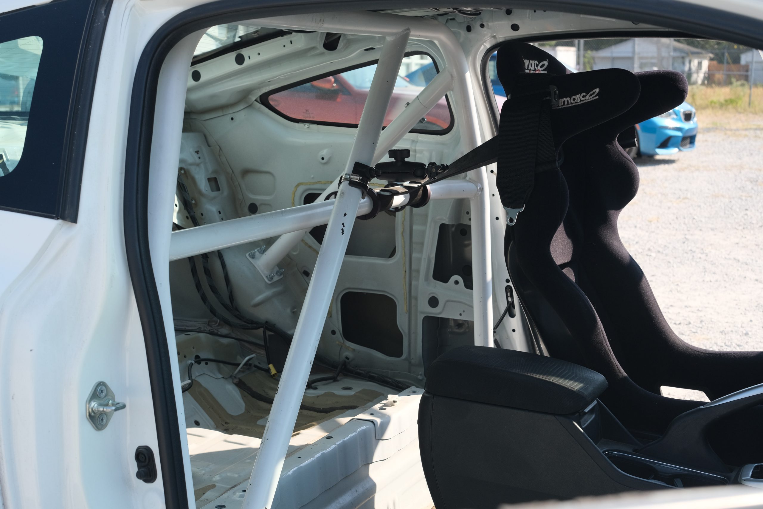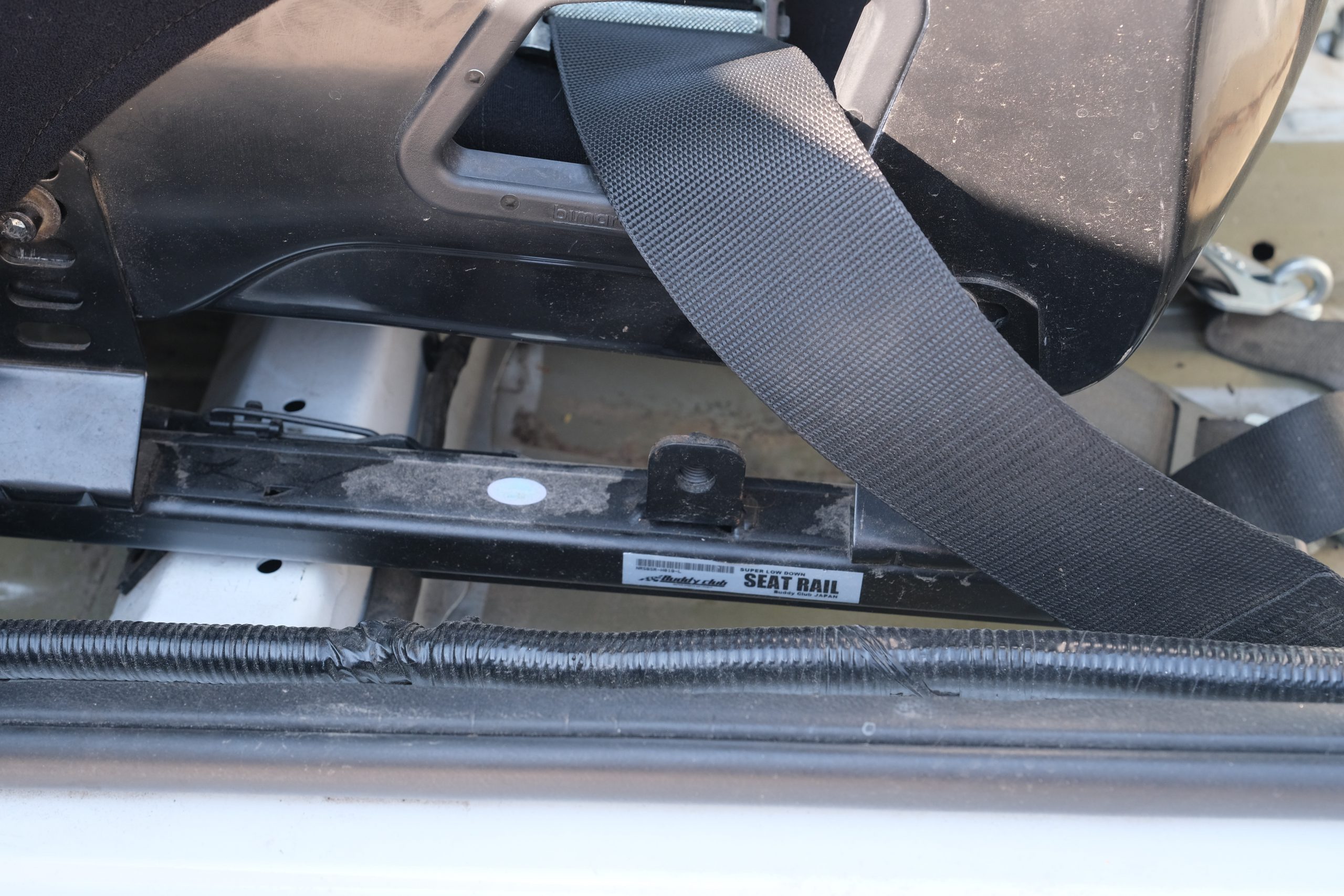 Bimarco fiberglass racing halo seat mounted on a Buddy Club seat slider with 6 point harness